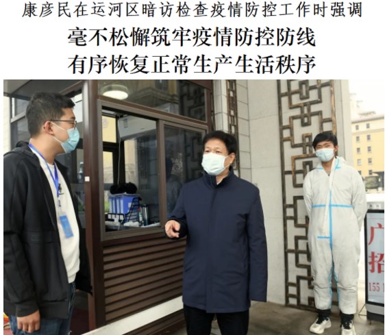 3月24日,市委書記康彥民就疫情防控和項目建設(shè)等工作到運河區(qū)暗訪檢查,并看望慰問一線工作人員。