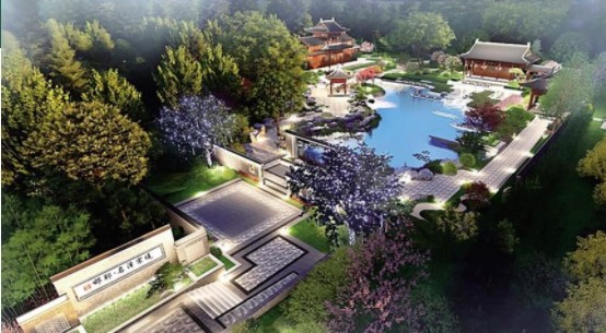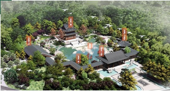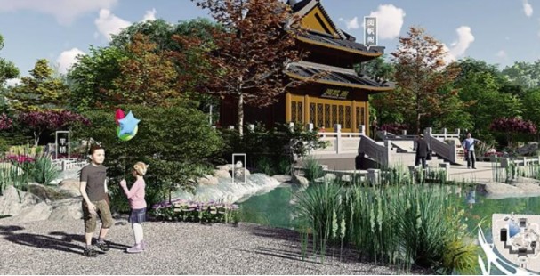 展現(xiàn)宋式建筑特色的要數(shù)“翠云禪茶”,主建筑翠云樓,屋檐滴水,雕梁繡柱,別有一番韻味;“云雅晚香”處的晚香樓,展現(xiàn)大名府文化的同時,也體現(xiàn)“執(zhí)政為民,廉潔奉公”的時代價值觀;“云月挹芬”,建筑與晚香樓相呼應(yīng),還原晚香堂外水池蓮藕、遍種黃花的場景?!傲杞窍阍啤碧幍牧锜熗?,位于制高點(diǎn)處,內(nèi)瞰園景,外攬山水,靈動的涌泉,漣漪陣陣,成為園內(nèi)外的視覺焦點(diǎn);“宋城煙云”則將掩埋在歷史深處等待挖掘的宋城,以抽象意境的形式展現(xiàn)在世人面前。