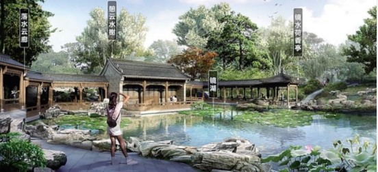 邯鄲園 ——宋云八景 河府文化 位于展園區(qū)南部、大堤東側(cè)的邯鄲園,融入大名府及運(yùn)河文化,建筑以宋風(fēng)為基調(diào),以云化名、一湖八景,營造宋云之境。 園中營造的8處景觀,無一不是意蘊(yùn)豐富,文化味兒十足。 隨著游人的腳步,宋云八景(以下簡稱八景),依次展開。入園后,最先映入眼簾的是掛畫“偷云入畫”,框景內(nèi),園中美景盡收畫中,游人可于此處閱覽全園。然后是“白溝云源”,大名府的白溝為運(yùn)河肇始,以舟形水源暗指運(yùn)河源頭,與運(yùn)河文化相呼應(yīng)?!袄@城踏云”處,青磚墻上設(shè)計意向城墻樣的鏤空圖案,懸掛官員簡介及銅靴,有繞城祈福和樹立官員典范的作用。