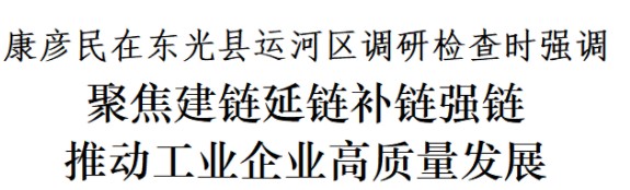 4月17日,市委書記康彥民到東光縣、運河區(qū)調(diào)研檢查。他強(qiáng)調(diào),要深入貫徹習(xí)近平新時代中國特色社會主義思想,完整準(zhǔn)確全面貫徹新發(fā)展理念,堅持工業(yè)強(qiáng)市、產(chǎn)業(yè)興市,真抓實干、挖掘潛力,創(chuàng)新驅(qū)動、激發(fā)活力,大力建鏈延鏈補(bǔ)鏈強(qiáng)鏈,推動工業(yè)企業(yè)做大做強(qiáng),為滄州高質(zhì)量發(fā)展提供重要支撐和堅實保障。