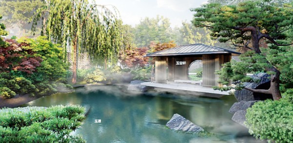 “丹青雅韻”場景,取雅集中觀畫之意境,閑坐半亭聽園內(nèi)萬壑松風,漫游長廊看玉器工藝巨著。其中,萬壑松風處,高低起伏的臺地樹池塑造了丘壑地形,游人可于登山步道隨臺地起伏登山而上,俯瞰臺地之上遍植松林,感受萬壑松風之意趣;“識玉雅頌”場景,取雅集中說經(jīng)之場景,后庭幽幽竹篁,跌瀑淺溪穿林而過匯入主湖面,營造出“水石潺湲,風竹相吞”的意境。主建筑黛玉山堂則延續(xù)與繼承了傳統(tǒng)木構建筑的黛色屋面與木屋架結構,將中國傳統(tǒng)建筑元素體現(xiàn)得淋漓盡致;“翰墨雅懷”場景,取雅集中題石之場景,黑色巨石破水而出,出園路徑穿石而過,露出光滑的石面,映襯記錄著過往的游客與美景。