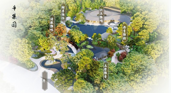 辛集園 ——玉文化園林 古韻味雅集 辛集園借《西園雅集圖》中文人雅士的5幕游園場景,提煉園林語言,以現(xiàn)代手法打造“詠、聽、畫、題、辯”五大玉文化園林空間,展現(xiàn)人文內(nèi)涵深厚的雅集新貌。 “詩歌雅詠”場景,取雅集中觀書之意境,選取詠玉詩篇于云墻之上:青瓦化山,云墻為卷,石臺為案,詩情處處融畫意;“玉磬雅音”場景,取雅集中聽琴之意境,林蔭華蓋轉譯為鄰水雅軒,軒內(nèi)懸掛最具代表的玉石樂器——玉磬復制品,聽著源自上古的玉磬之聲,臨水坐看對岸林泉山澗,頓入空谷幽蘭之境。