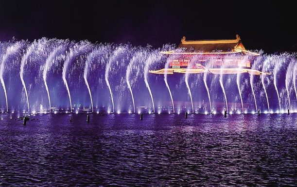 夜幕降臨,這片水域瞬間靈動(dòng)起來(lái)。水柱、燈光、激光……多種元素創(chuàng)新融為一體,音樂(lè)噴泉蔚為壯觀,水幕電影繽紛絢爛,為市民帶來(lái)一場(chǎng)震撼的視聽(tīng)盛宴。