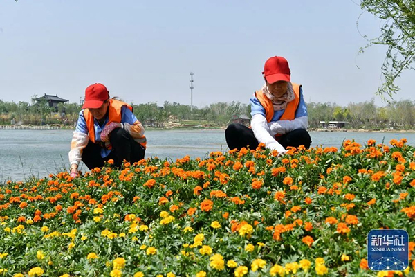 ↑5月12日,工人在滄州園博園內(nèi)養(yǎng)護花卉。