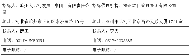 5.提出異議的渠道和方式:招標(biāo)代理地址:滄州市運(yùn)河區(qū)天成大廈1701室,電話:0317-2038866 郵箱:hbczfz@126.com