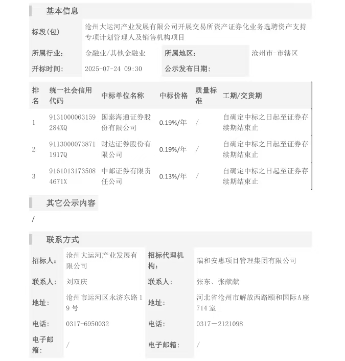滄州大運(yùn)河產(chǎn)業(yè)發(fā)展有限公司開展交易所資產(chǎn)證券化業(yè)務(wù)選聘資產(chǎn)支持專項(xiàng)計(jì)劃管理人及銷售機(jī)構(gòu)項(xiàng)目